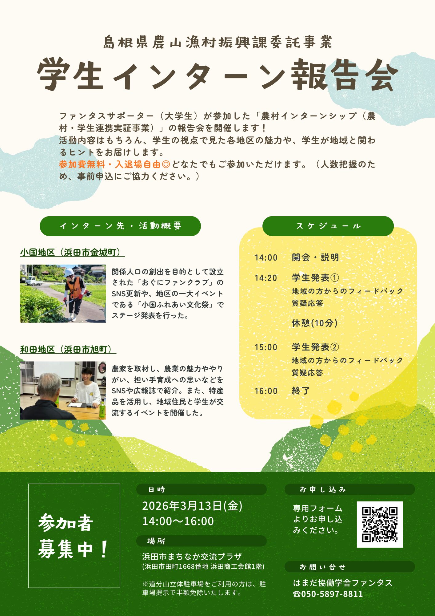 はまだ協働学舎ファンタスのファンタスサポーター(大学生)が参加した、「農村インターンシップ(農村・学生連携実証事業)」 の報告会が開催されます!
