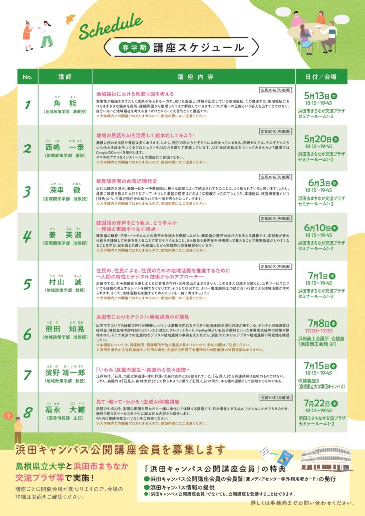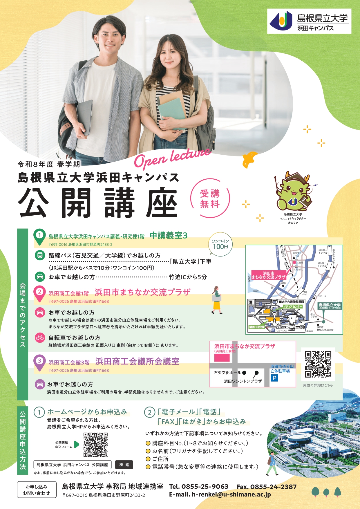 島根県立大学浜田キャンパスの公開講座(春学期)が、浜田市まちなか交流プラザで開催されます!